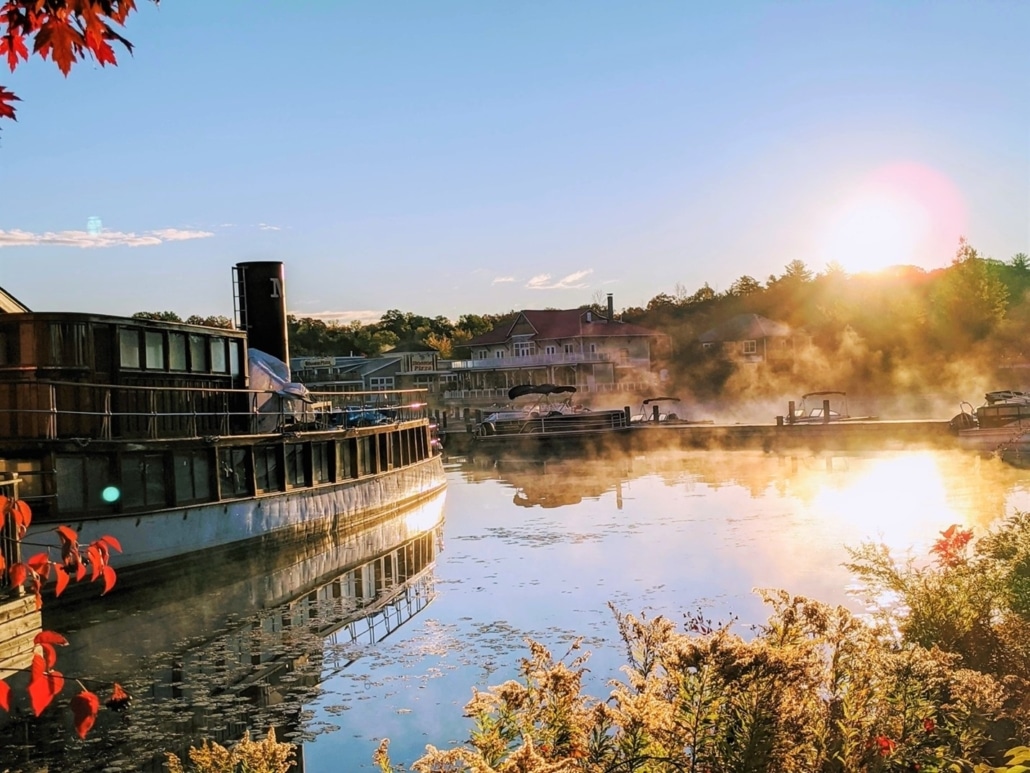 Muskoka Wharf features a picturesque fall foliage boardwalk that winds along the shoreline, inviting you to explore charming shops, indulge in a delicious meal, or relax at a cozy café or tea house. The wharf is bookended by the historic steamship cruise office on one end and the Muskoka Discovery Centre museum on the other, making it a perfect spot to soak in Muskoka’s rich heritage and scenic beauty.