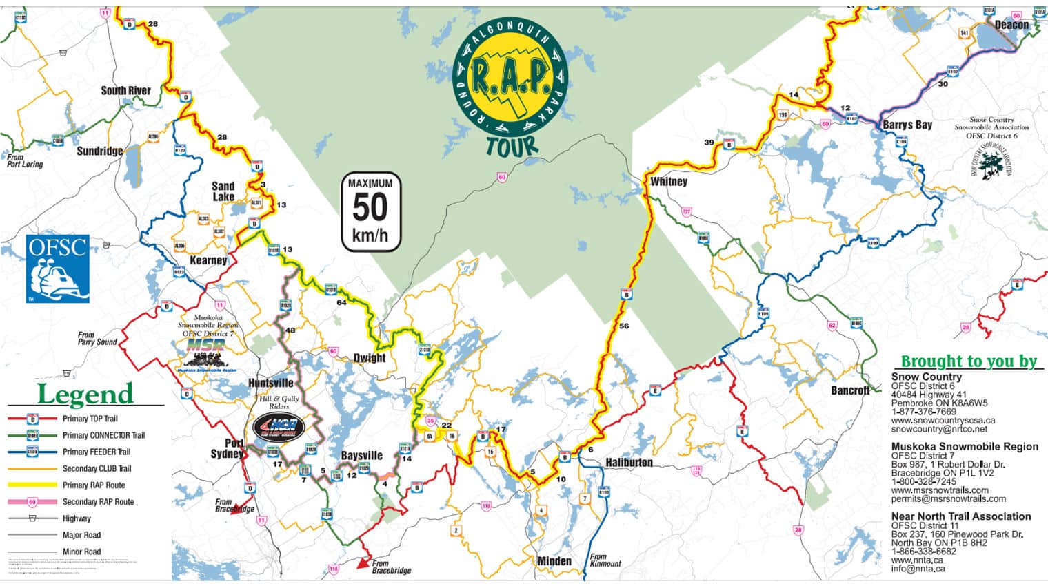 Click here to download a PDF of the full RAP Tour. You can also access the route digitally on the OFSC website. Visit their Interactive Trail Guide, and in the top right corner select the Snow Tours drop-down. Choose Eastern Ontario > R.A.P.